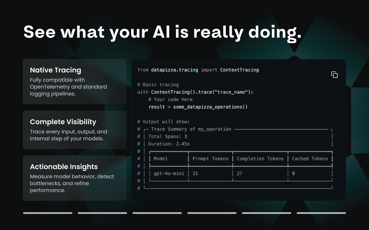 In Datapizza AI ogni azione è osservabile: tracing completo di ogni step, logging strutturato, gestione degli errori chiara.